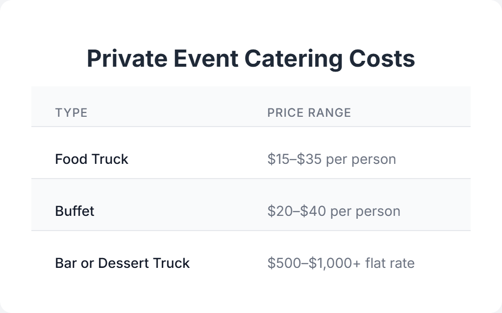 Backyard birthdays, graduations, anniversaries, and reunions are perfect for mobile catering. For events under 50 guests, you may not hit the food truck minimum, so plan for a base fee of $1,000–$1,200, even if it’s just for dessert.