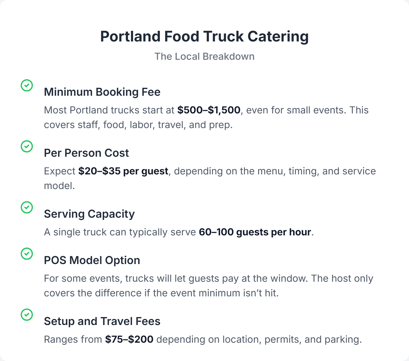In general, catering in Portland runs from $25 to $85+ per guest, with costs depending on cuisine, service style, guest count, and day of the week. Food truck catering tends to be a more affordable and flexible option, especially for outdoor venues, casual events, or pop-up activations.